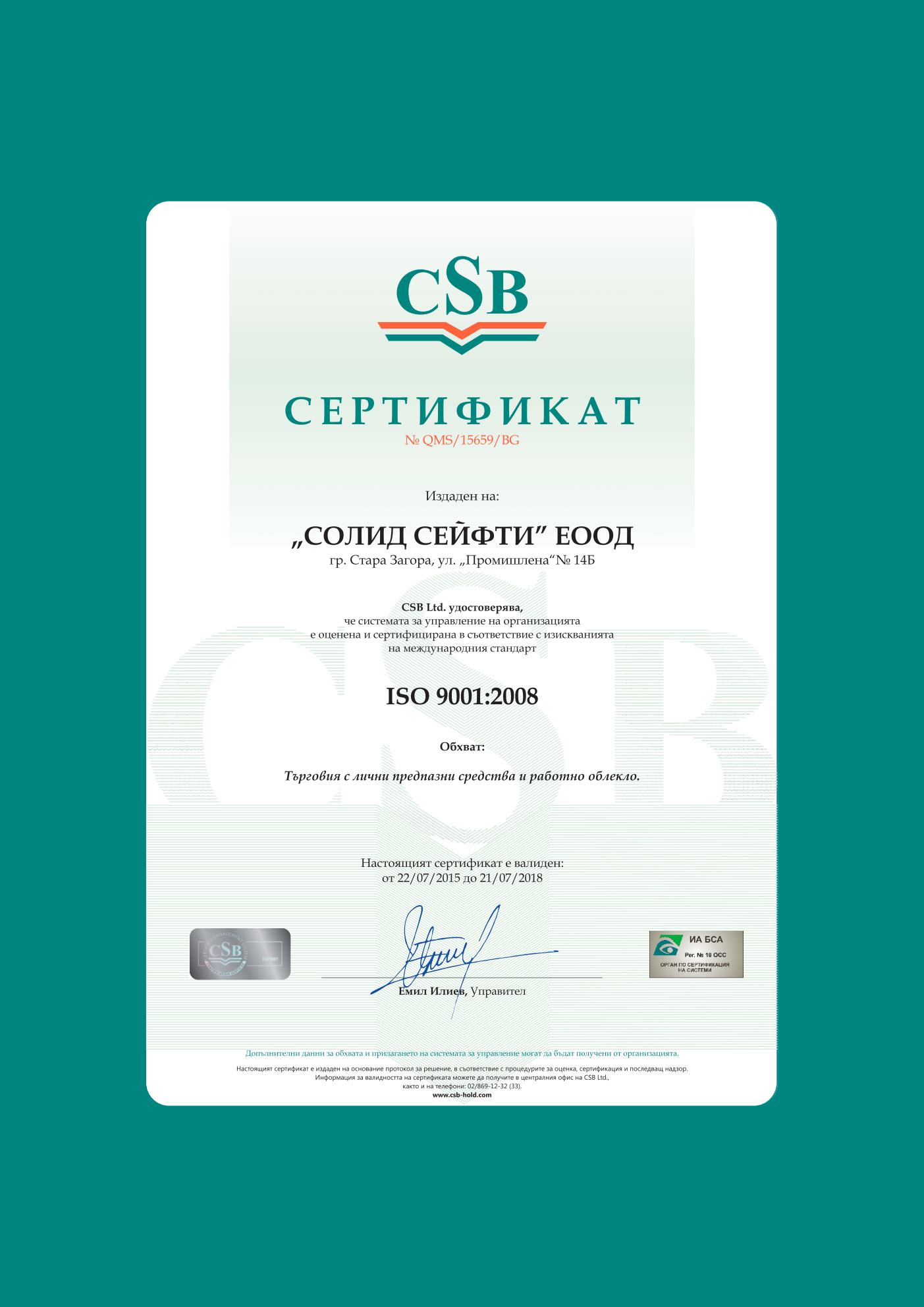 Солид Сейфти ЕООД въведе Система за управление на качеството съгласно стандарта ISO 9001:2008, която описва детайлно правилата за извършване на всички процеси и етапи от работата на дружеството и свързаните с тях отговорности. Правилата са разработени специално с оглед предмета на дейност на дружеството, за да осигурят в най-висока степен качественo обслужване на клиентите и задоволяване на всички техни нужди и изисквания. Екипът на дружеството се придържа стриктно към правилата, залегнали в Системата за управление на качеството, стреми се към недопускане на несъответствия с приложимите правила и нормативни изисквания и носи отговорност за качеството на извършваните дейности.